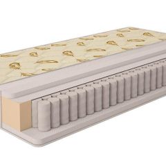 Блок независимых пружин TFK. Такой блок исключает нежелательные колебания конструкции, за счет работы пружин по всей высоте, и равномерно распределяет нагрузку по всей площади. Проволока, из которой изготавливаются пружины, имеет больший диаметр, что делает матрас более упругим и долговенчым. Независимый пружинный блок совершенно не производит шума. Количество пружин на одно спальное место - 550. Срок службы матрасов - 10 лет.
